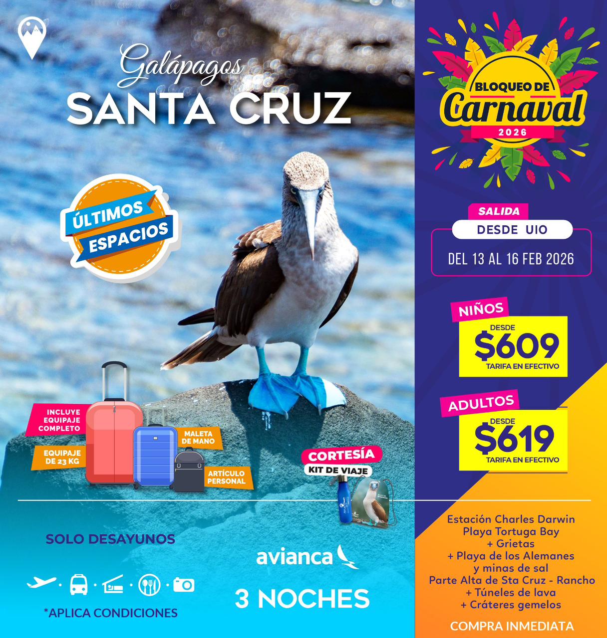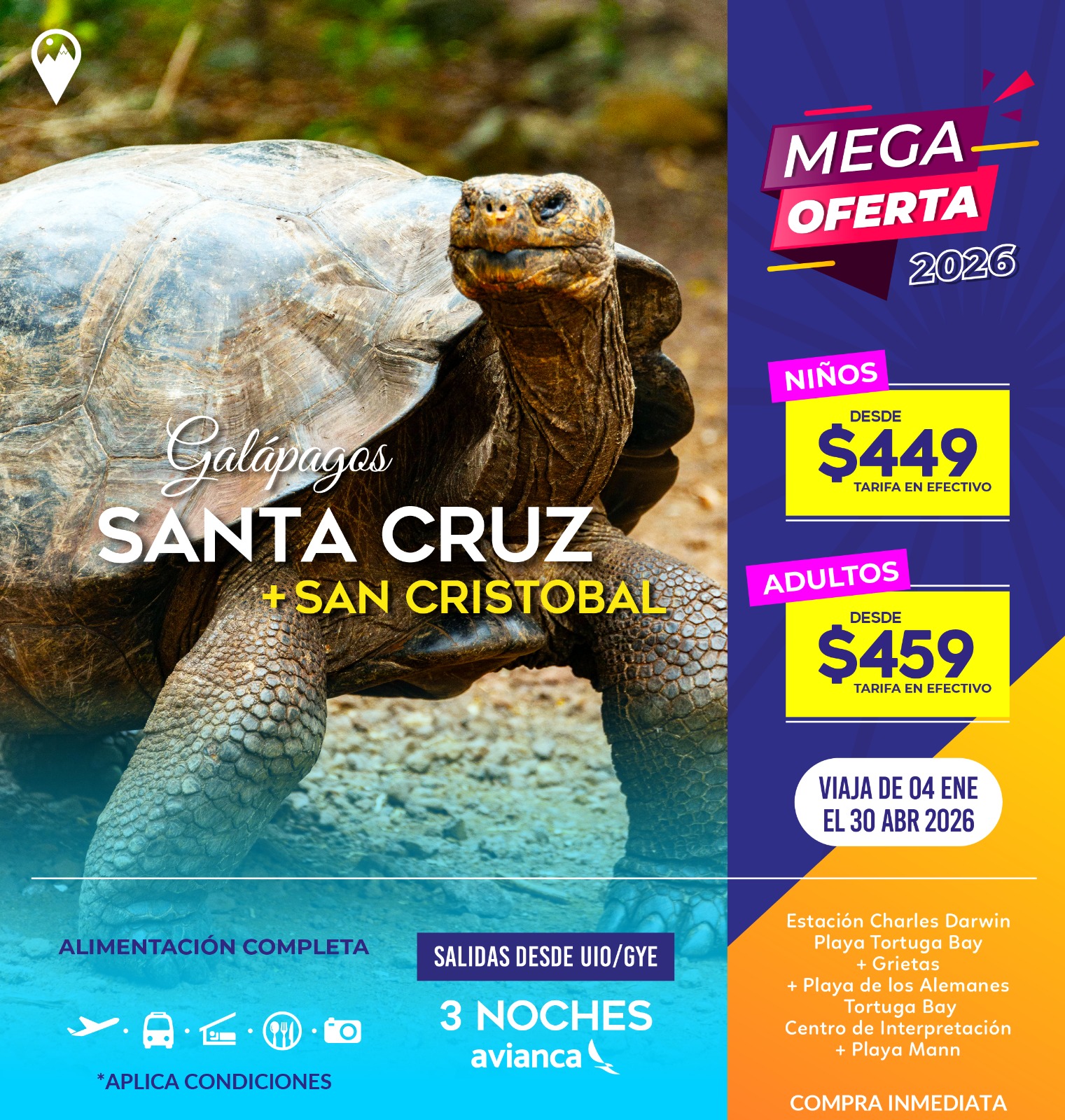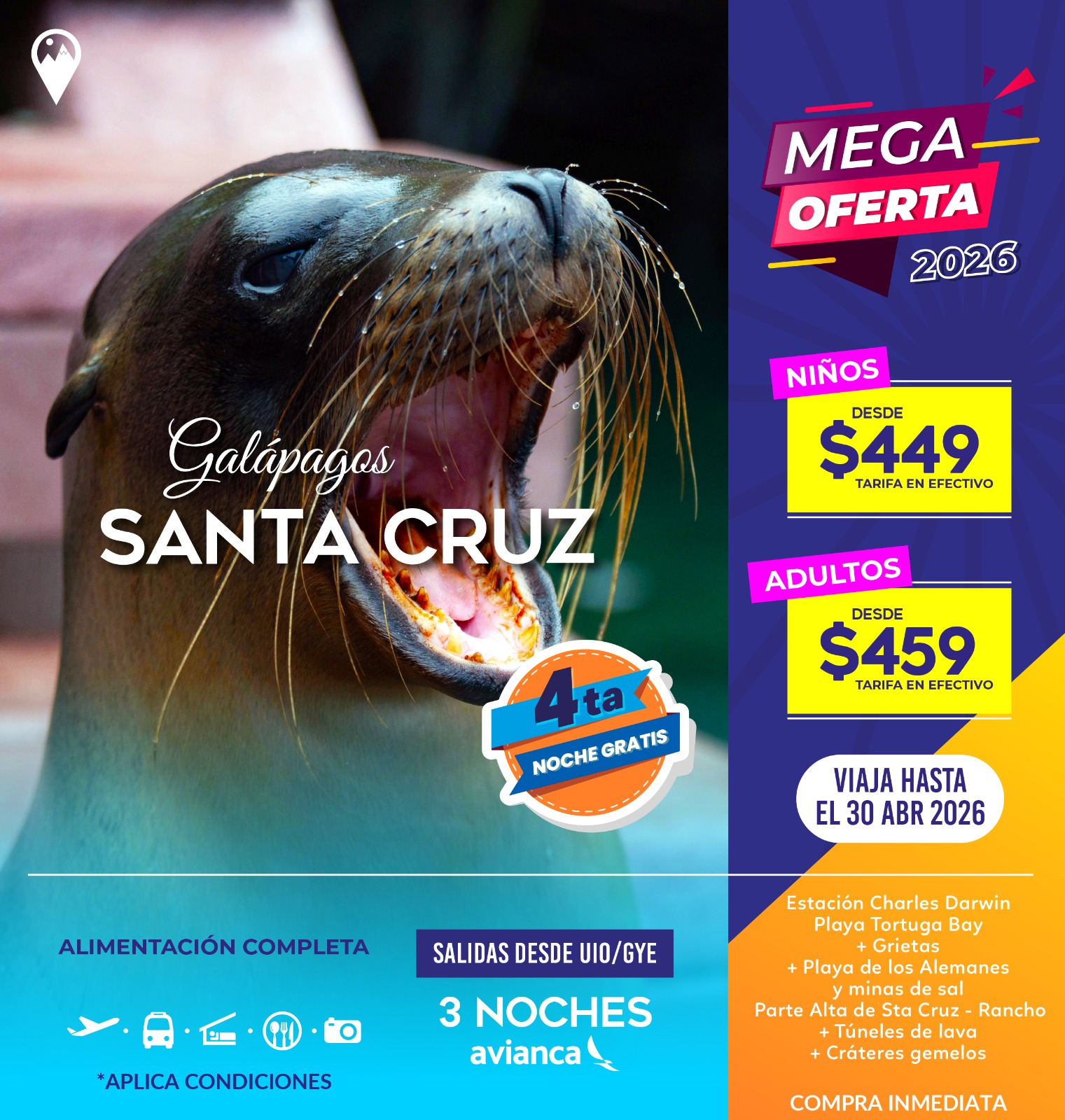 Las islas son hogar de especies únicas que no encontrarás en ningún otro lugar: tortugas gigantes, iguanas marinas, piqueros de patas azules, lobos marinos y una increíble diversidad de aves y vida marina.
