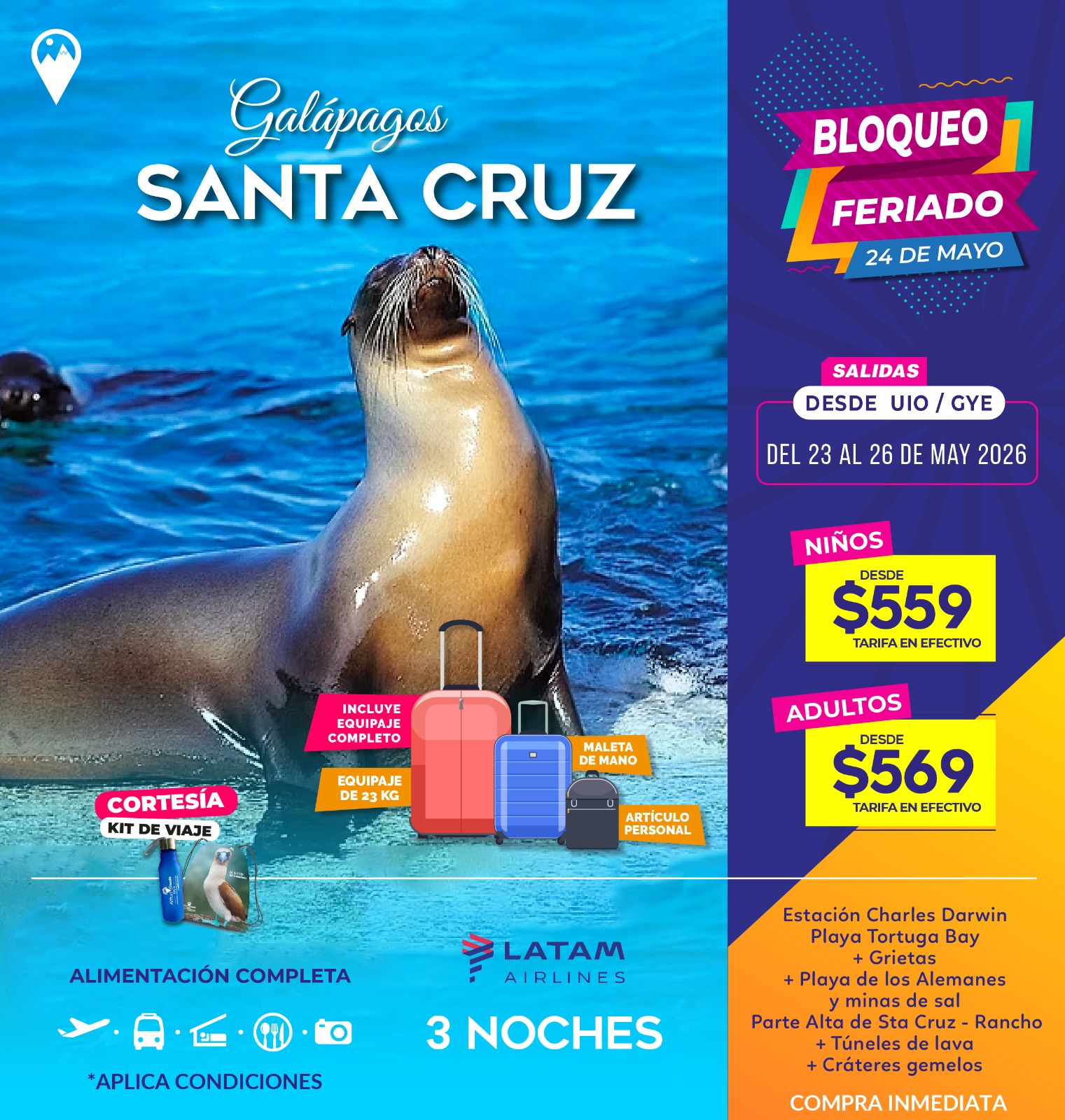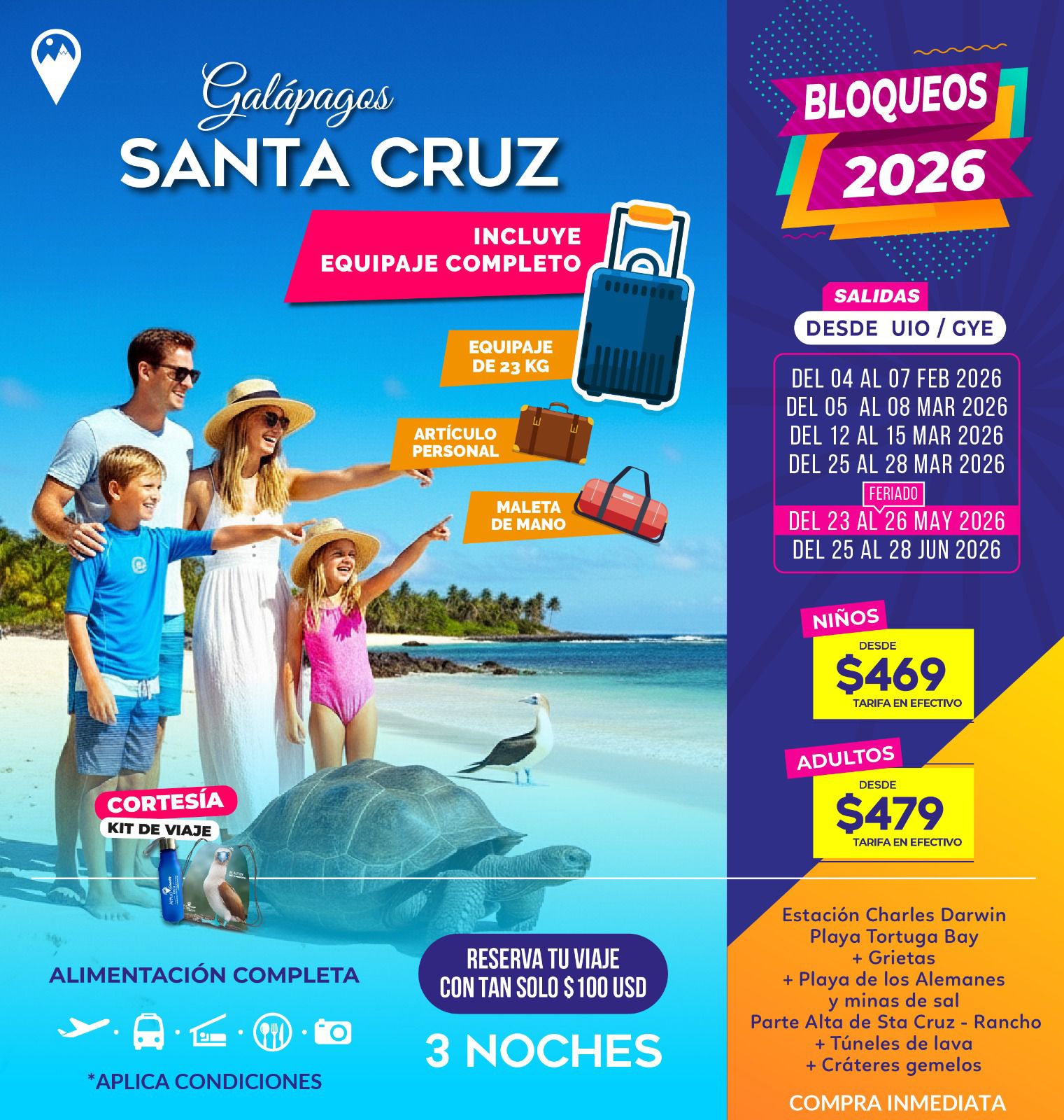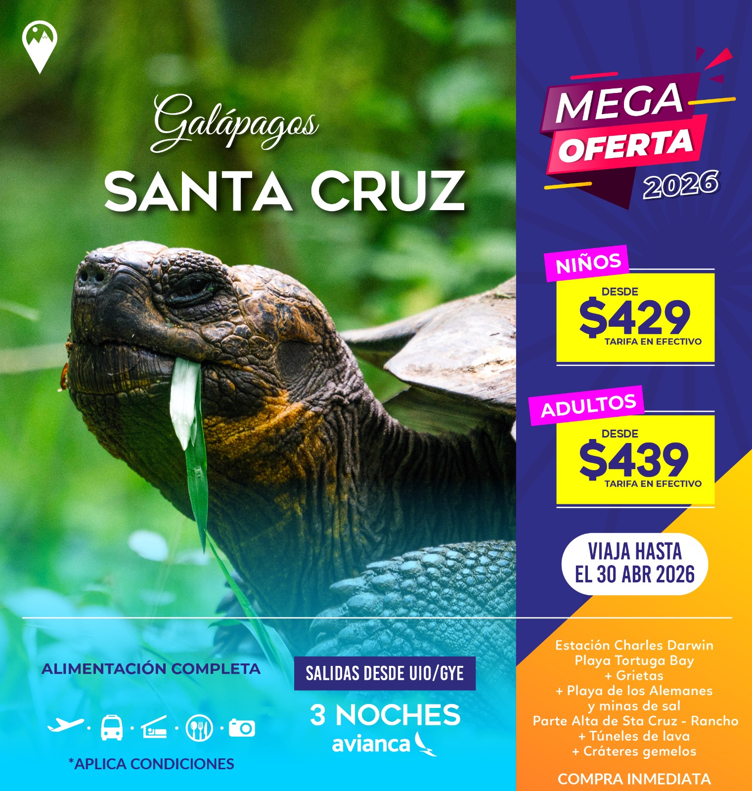 Las islas son hogar de especies únicas que no encontrarás en ningún otro lugar: tortugas gigantes, iguanas marinas, piqueros de patas azules, lobos marinos y una increíble diversidad de aves y vida marina.